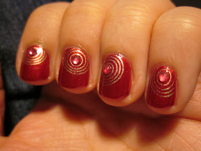 Zur Trockenzeit kann ich nichts sagen, weil ich einen Schnelltrocknerlack und die essence quick dry drops darüber verwendet habe. Und dann habe ich mich mal wieder in Nailart geübt. Wobei das Design sich mehr oder weniger entwickelt hat. Ursprünglich wollte ich ein anderes Stampingmotiv. Das hat aber auf dem Untergrund leider nicht so gewirkt wie ich es mir vorgestellt hatte. also habe ich mich für ein anderes entschieden. Aber nach dem Stampen war ich da auch noch nicht so richtig zufrieden und habe meine Steinchen und sonstigen Nailartsachen rausgekramt. Ich wollte nur ein paar von diesen kleinen runden Plättchen aufkleben und irgendwie sind es schrittweise immer mehr geworden, weil ich immer noch nicht zufrieden war.
